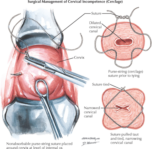 Cervical cerclage is the placement of a suture or tape to support and partially occlude the uterine cervix to reduce the risk of preterm delivery in the face of cervical insufficiency. A number of procedures have been described, but the most common and simplest is the McDonald cerclage, which is described here. Cervical cerclage may also be accomplished by placing the suture by an abdominal route, although this is a much more invasive procedure and the suture is generally left in place permanently, precluding vaginal